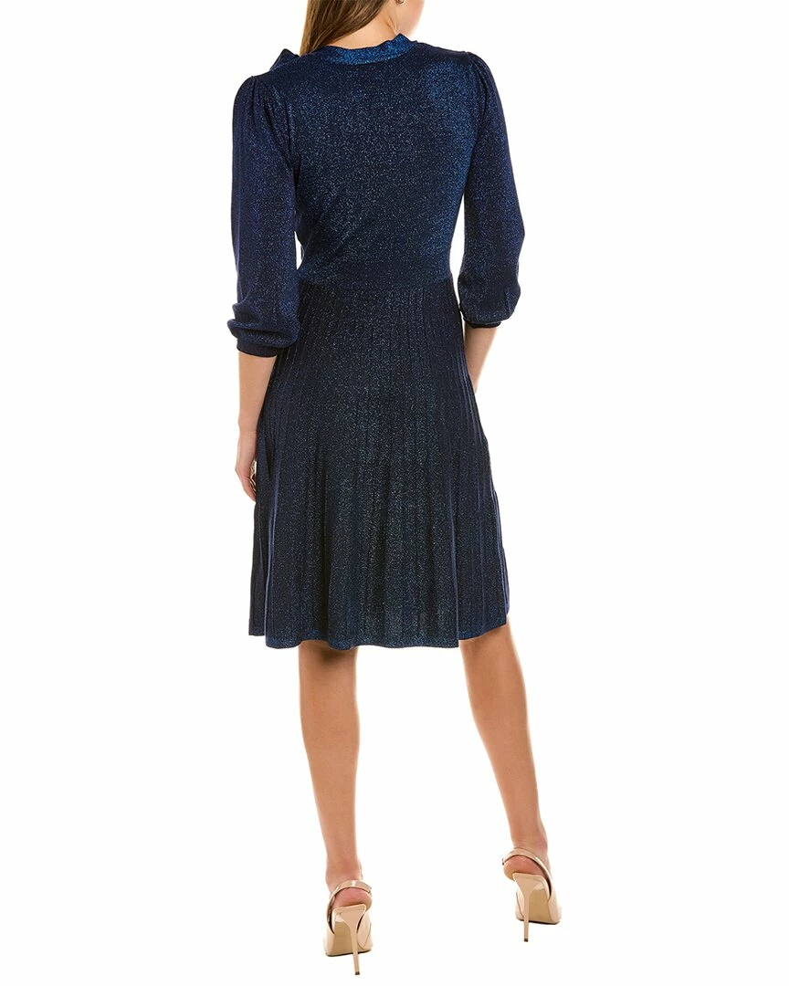 - Design details: metallic knit, self-tie neck sash, pleated skirt and ribbed trim