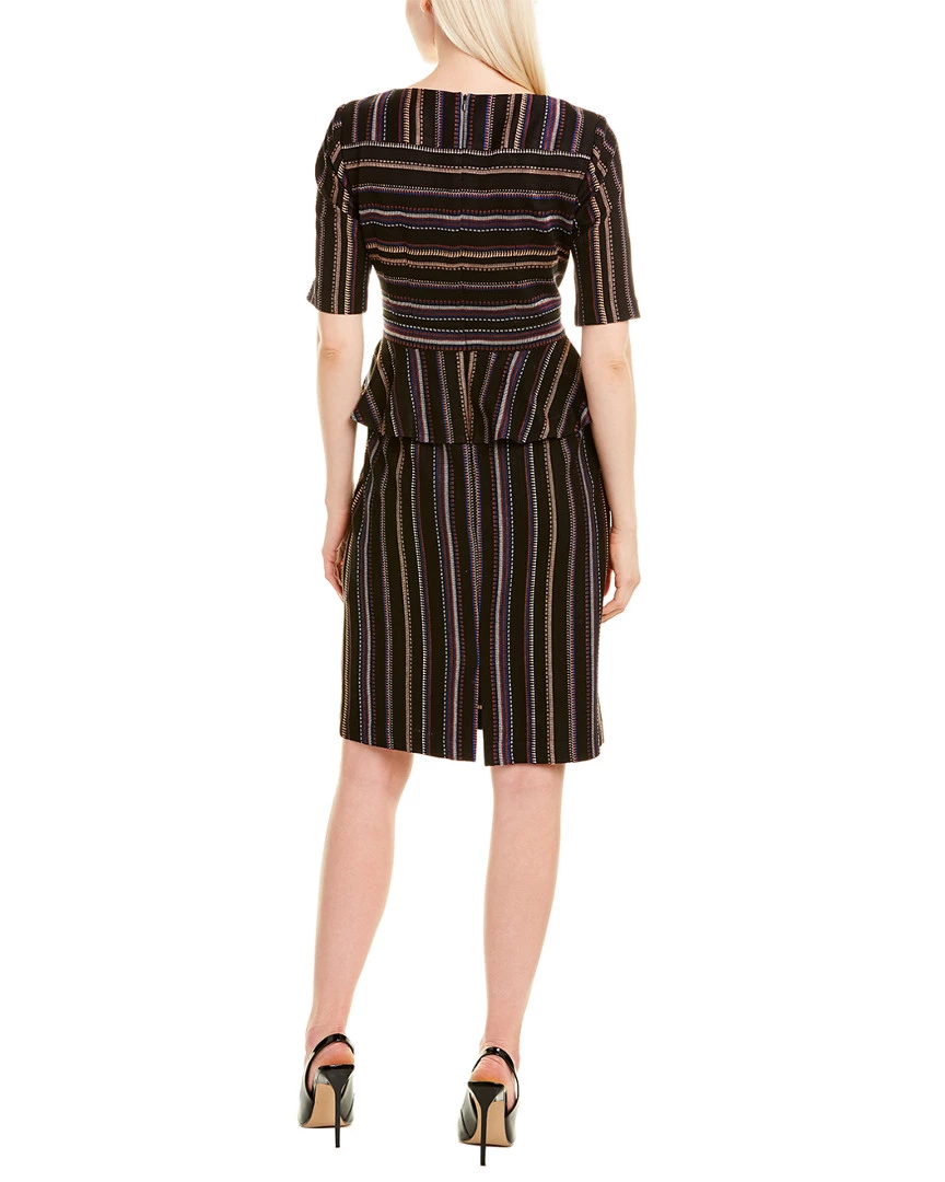 - Design details: V-neck, elbow-length sleeves, peplum ruffle at waist, vented back hem