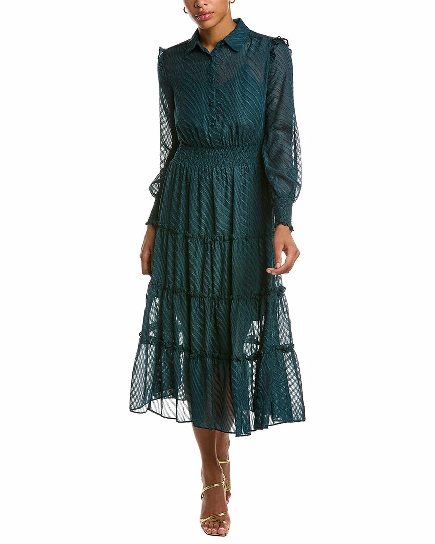 - Design details: spread collar, ruffled shoulders, smocked cuffs and waist, and tiered skirt