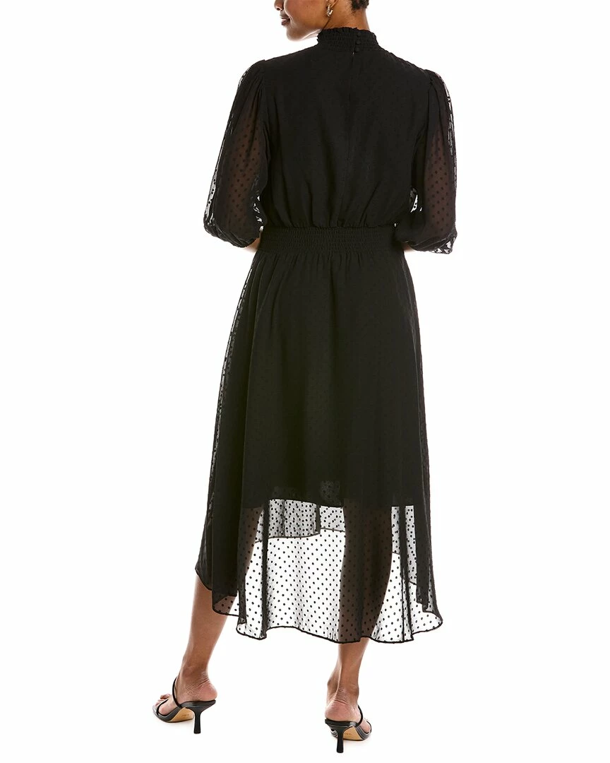 - Design details: Swiss dot design, smocked collar, 3/4-length sleeves, smocked waist, and high-low hem
