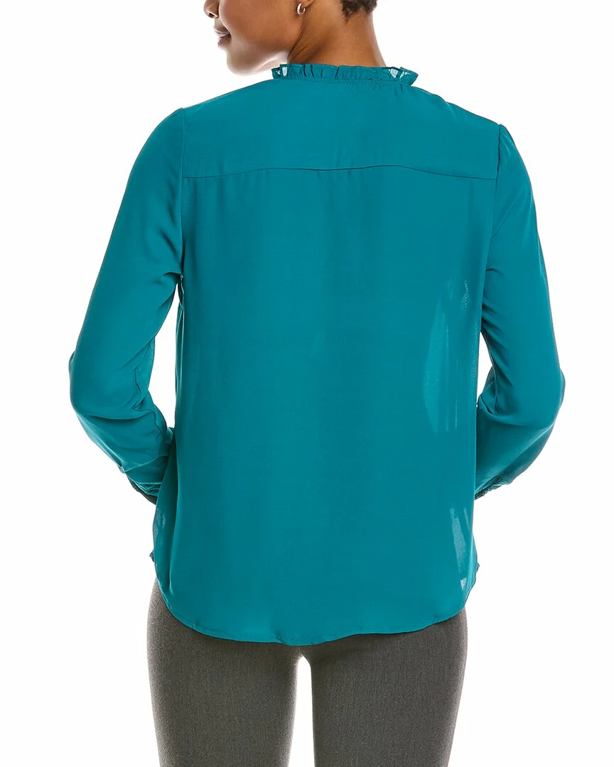 - Design details: split neckline, ruffle trim, pintuck detailing and button cuffs