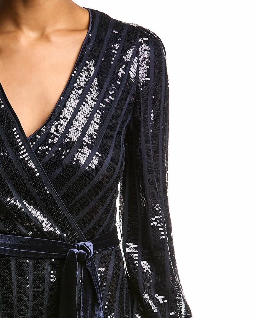 - Design details: surplice front, elasticized cuffs, and velvet tie sash at waist